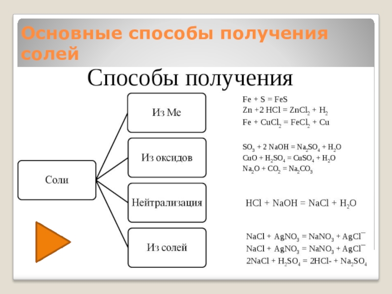 1. Соли взаимодействуют с кислотами и основаниями, если в результате реакции получается продукт, который выходит из сферы реакции (осадок, газ, вода):