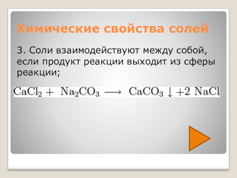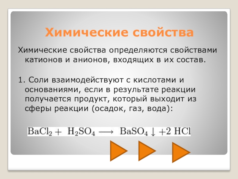 Химические свойстваХимические свойства определяются свойствами катионов и анионов, входящих в их состав.1. Соли взаимодействуют с кислотами и