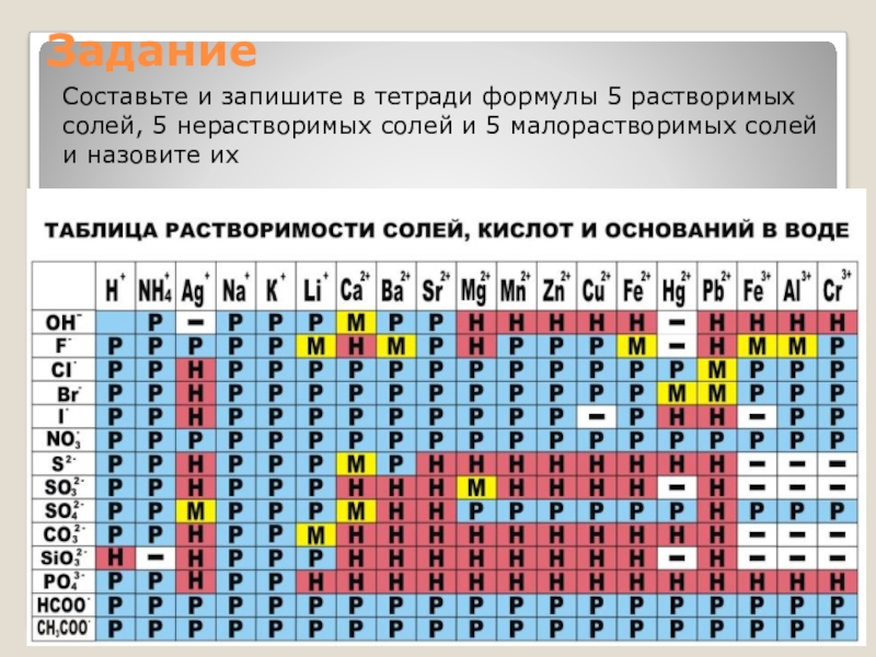 ЗаданиеСоставьте и запишите в тетради формулы 5 растворимых солей, 5 нерастворимых солей и 5 малорастворимых солей и