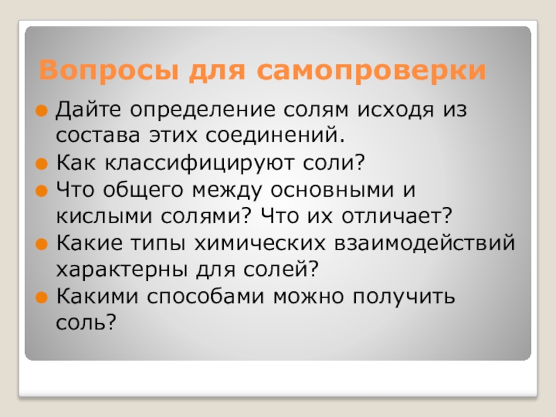 Вопросы для самопроверкиДайте определение солям исходя из состава этих соединений.Как классифицируют соли?Что общего между основными и кислыми