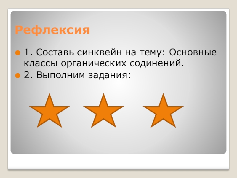 Рефлексия1. Составь синквейн на тему: Основные классы органических содинений.2. Выполним задания: