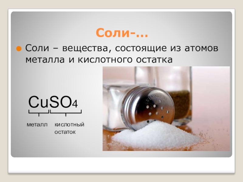Соли-…Соли – вещества, состоящие из атомов металла и кислотного остаткаCuSO4металлкислотный остаток