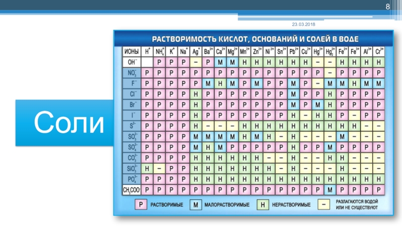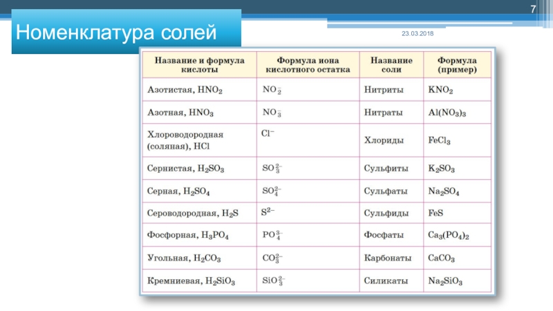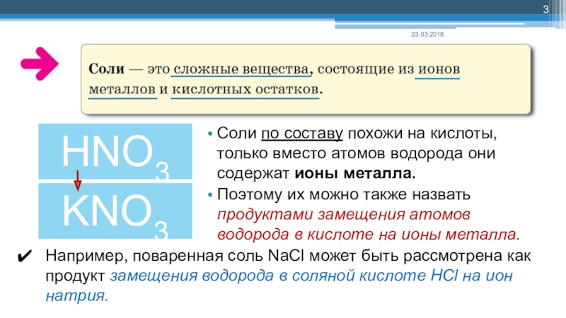 Например, поваренная соль NaCl может быть рассмотрена как продукт замещения водорода в соляной кислоте HCl на ион натрия.