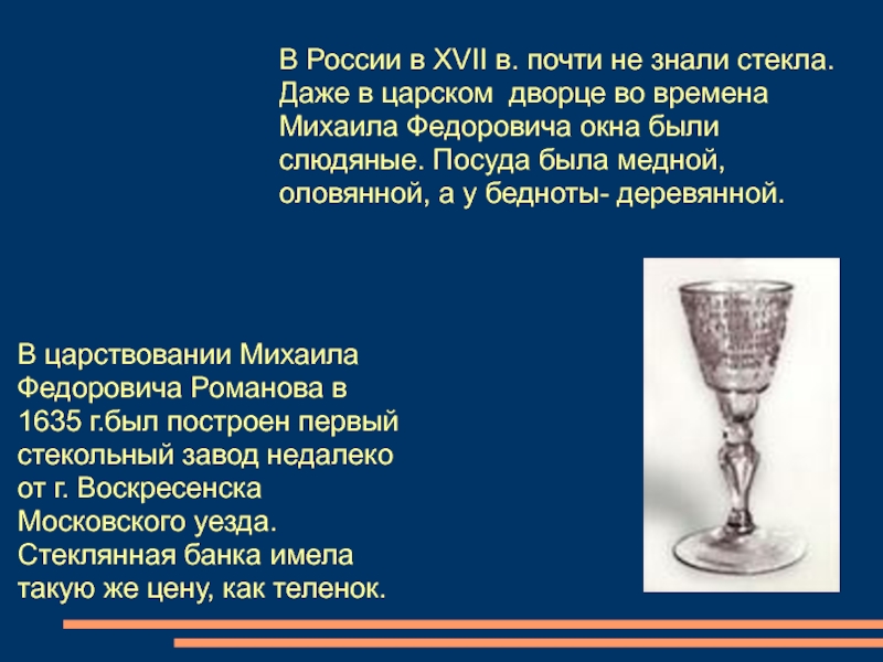 В царствовании Михаила Федоровича Романова в 1635 г.был построен первый стекольный завод недалеко от г. Воскресенска Московского уезда. Стеклянная банка имела такую же цену, как теленок.