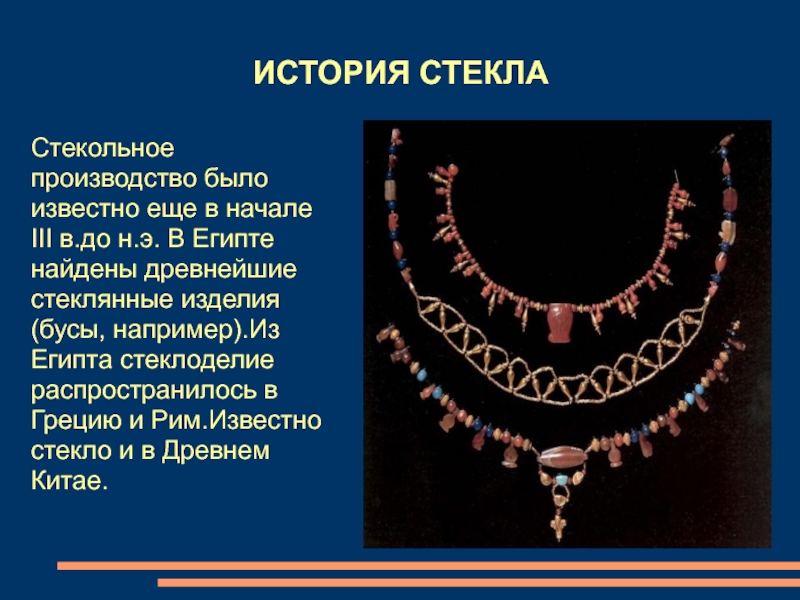 н.э. В Египте найдены древнейшие стеклянные изделия (бусы, например).Из Египта стеклоделие распространилось в Грецию и Рим.Известно стекло и в Древнем Китае.