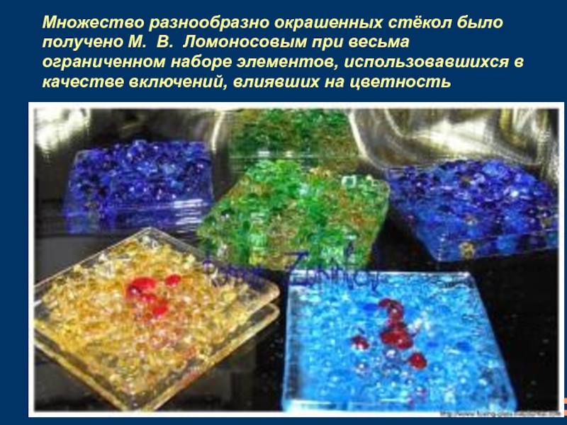 Слайд 6Множество разнообразно окрашенных стёкол было получено М. В. Ломоносовым при весьма