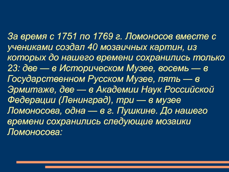 создал 40 мозаичных картин, из которых до нашего времени сохранились только 23: две — в Историческом Музее, восемь — в Государственном Русском Музее, пять — в Эрмитаже, две — в Академии Наук Российской Федерации (Ленинград), три — в музее Ломоносова, одна — в г. Пушкине. До нашего времени сохранились следующие мозаики Ломоносова: