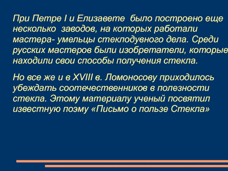 Но все же и в XVIII в. Ломоносову приходилось убеждать соотечественников в полезности стекла. Этому материалу ученый посвятил известную поэму «Письмо о пользе Стекла»