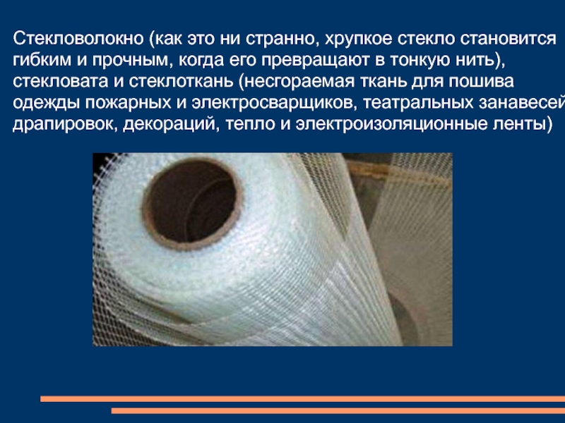 когда его превращают в тонкую нить), стекловата и стеклоткань (несгораемая ткань для пошива одежды пожарных и электросварщиков, театральных занавесей, драпировок, декораций, тепло и электроизоляционные ленты)