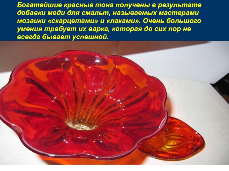 Слайд 8Богатейшие красные тона получены в результате добавки меди для смальт, называемых