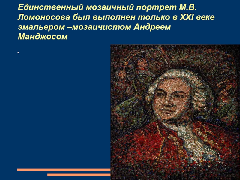 Слайд 17Единственный мозаичный портрет М.В.Ломоносова был выполнен только в XXI веке эмальером