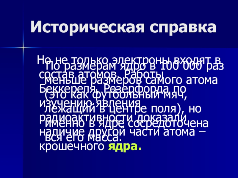 По размерам ядро в 100 000 раз меньше размеров самого атома (это как футбольный мяч, лежащий в центре поля), но именно в ядре сосредоточена вся его масса.