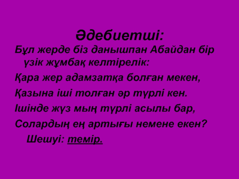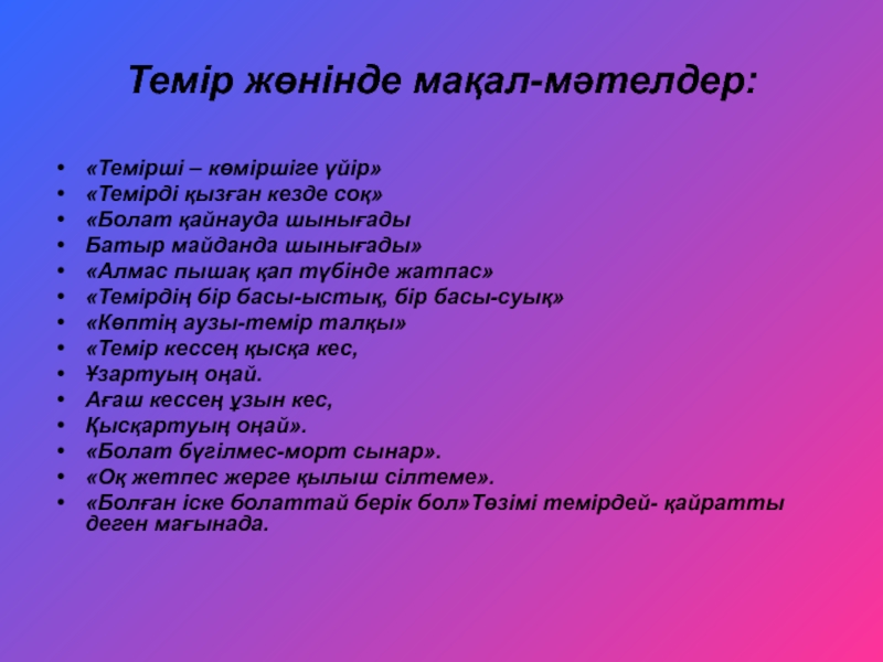 10. Темір туралы мақал – мәтелдер; (әдебиетші)