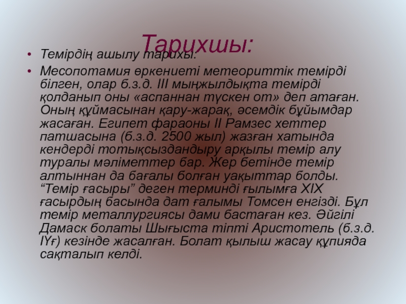 Месопотамия өркениеті метеориттік темірді білген, олар б.з.д. ІІІ мыңжылдықта