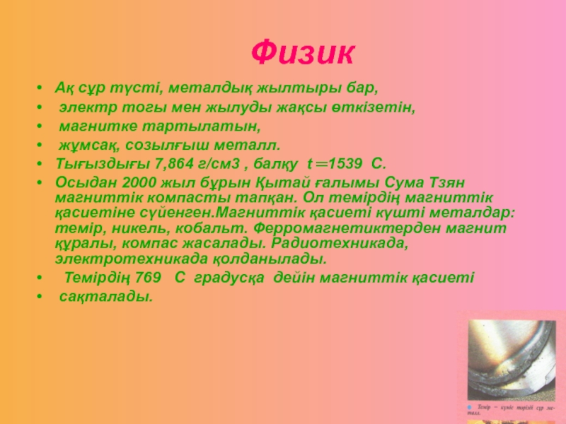 Тығыздығы 7,864 г/см3 , балқу t ═1539 С.