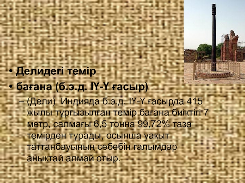 жылы тұрғызылған темір бағана биіктігі 7 метр, салмағы 6,5 тонна 99,72% таза темірден тұрады, осынша уақыт таттанбауының себебін ғалымдар анықтай алмай отыр.