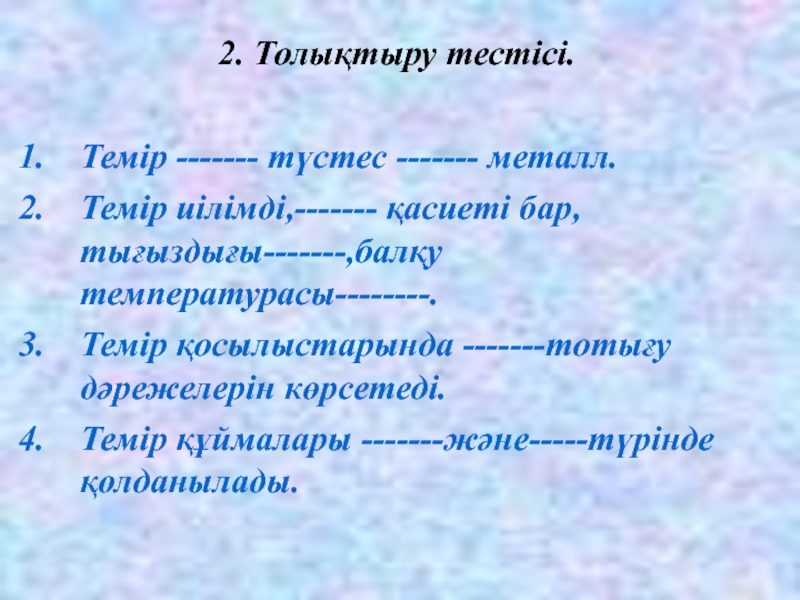12.Бекіту (Деңгейлік тапсырмалар,бекіту сұрақтары,тәжірибе,тест)