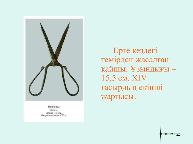 Слайд 23 Ерте кездегі темірден жасалған қайшы. Ұзындығы – 15,5 см. XIV ғасырдың