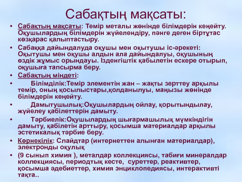 Сабақтың мақсаты: Темір металы жөнінде білімдерін кеңейту. Оқушылардың білімдерін жүйелендіру,
