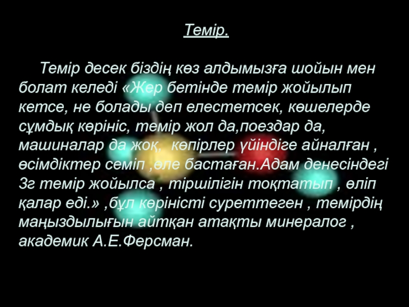 темір жойылып кетсе, не болады деп елестетсек, көшелерде сұмдық көрініс, темір жол да,поездар да, машиналар да жоқ, көпірлер үйіндіге айналған ,өсімдіктер семіп ,өле бастаған.Адам денесіндегі 3г темір жойылса , тіршілігін тоқтатып , өліп қалар еді.» ,бұл көріністі суреттеген , темірдің маңыздылығын айтқан атақты минералог , академик А.Е.Ферсман.
