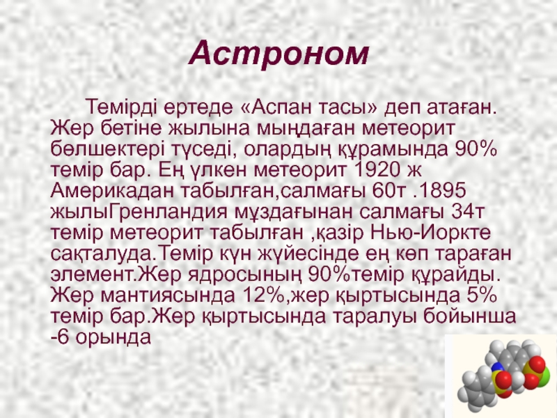 бөлшектері түседі, олардың құрамында 90% темір бар. Ең үлкен метеорит 1920 ж Америкадан табылған,салмағы 60т .1895 жылыГренландия мұздағынан салмағы 34т темір метеорит табылған ,қазір Нью-Иоркте сақталуда.Темір күн жүйесінде ең көп тараған элемент.Жер ядросының 90%темір құрайды.Жер мантиясында 12%,жер қыртысында 5%темір бар.Жер қыртысында таралуы бойынша -6 орында