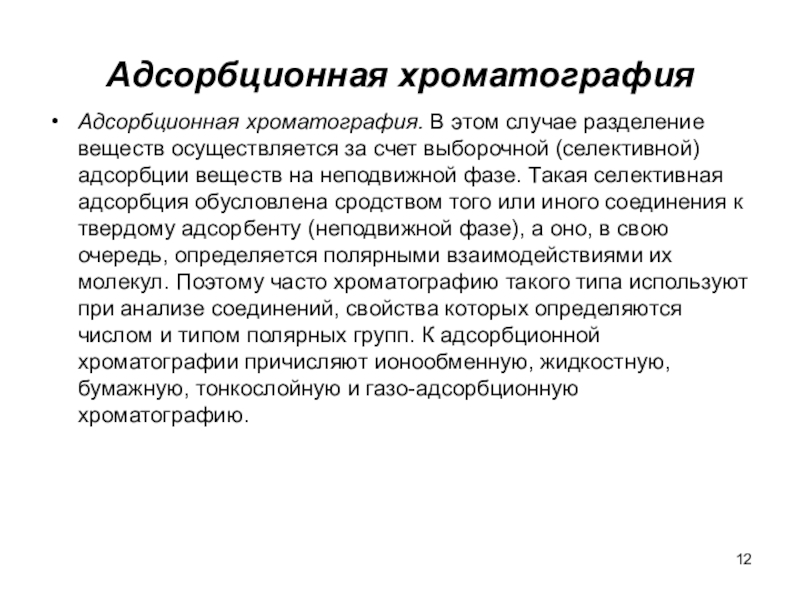 Адсорбционная хроматография - метод, основанный на многократном перераспределении молекул определяемого компонента (сорбата) между подвижной фазой (элюентом) и поверхностью твердого сорбента вследствие адсорбции и десорбции этих молекул. Если адсорбционные свойства компонентов смеси различны, то при движении элюента через сорбент компоненты разделяются.