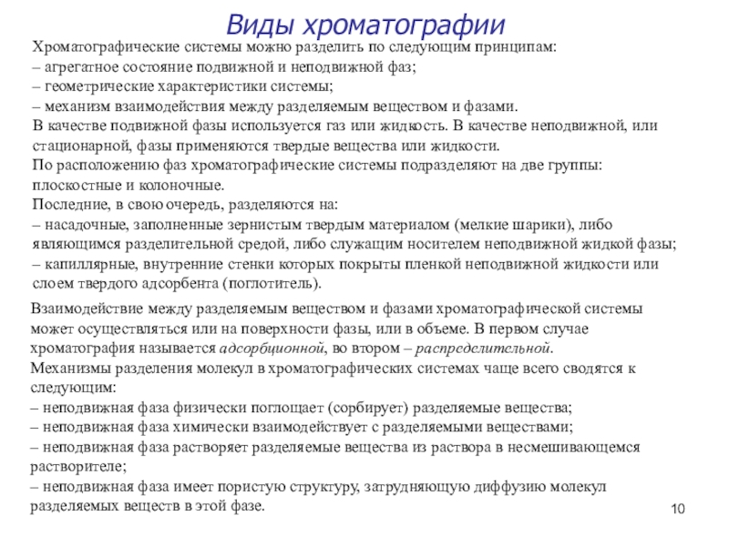 Взаимодействие между разделяемым веществом и фазами хроматографической системы может осуществляться или на поверхности фазы, или в объеме. В первом случае хроматография называется адсорбционной, во втором – распределительной.