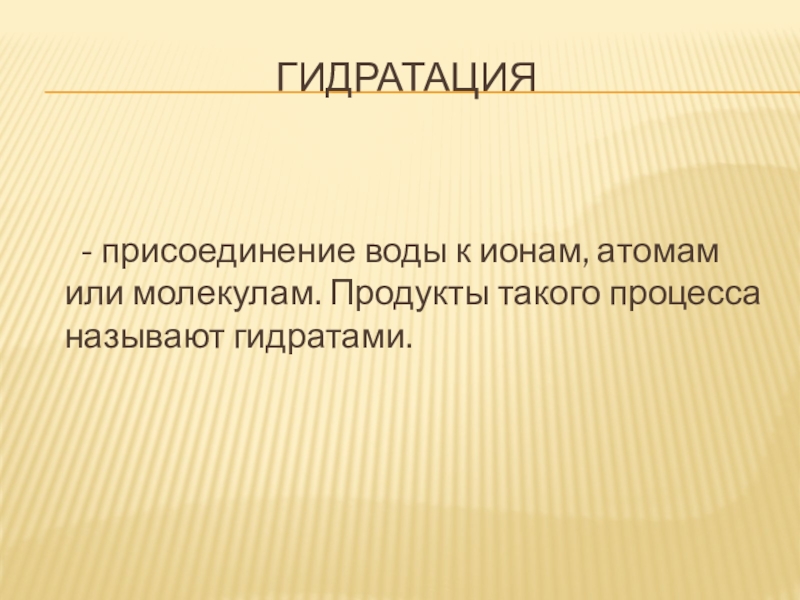 Гидратация   - присоединение воды к ионам, атомам или молекулам. Продукты такого процесса называют гидратами.