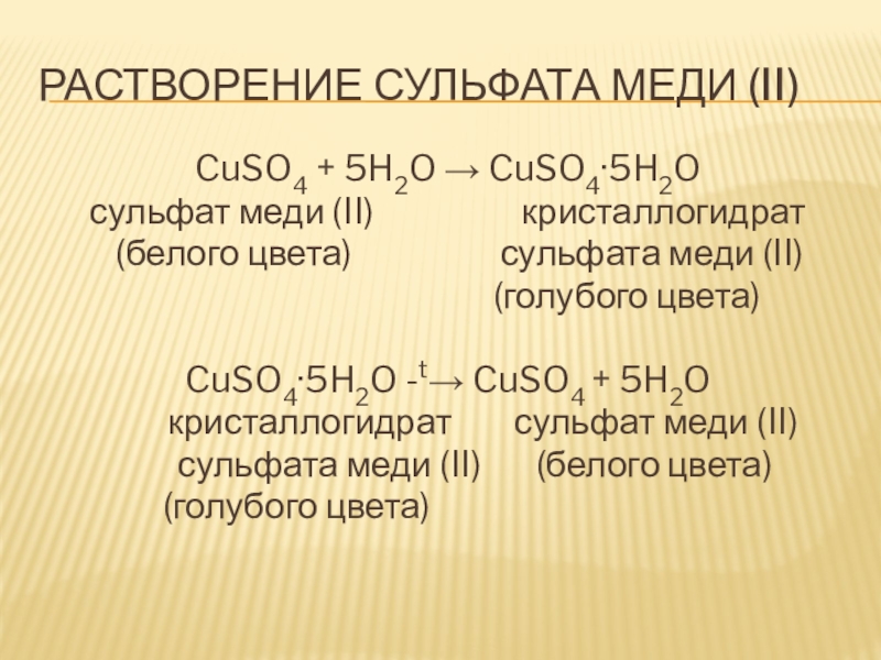 Растворение сульфата меди (II)CuSO4 + 5H2O → CuSO4·5H2Oсульфат меди (II)