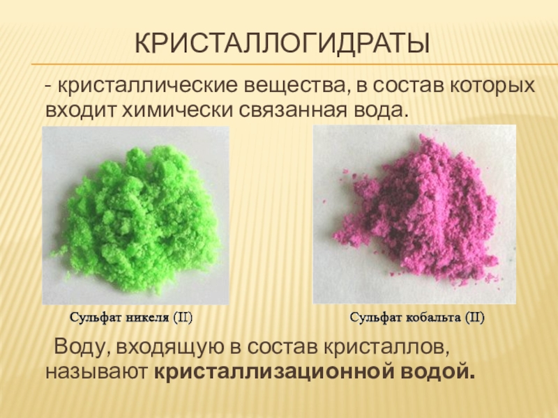 Кристаллогидраты  - кристаллические вещества, в состав которых входит химически связанная вода.