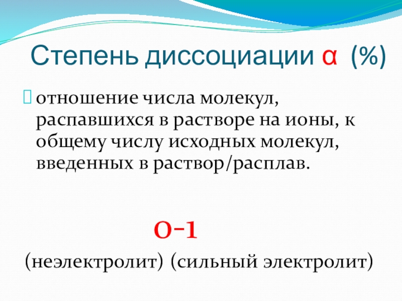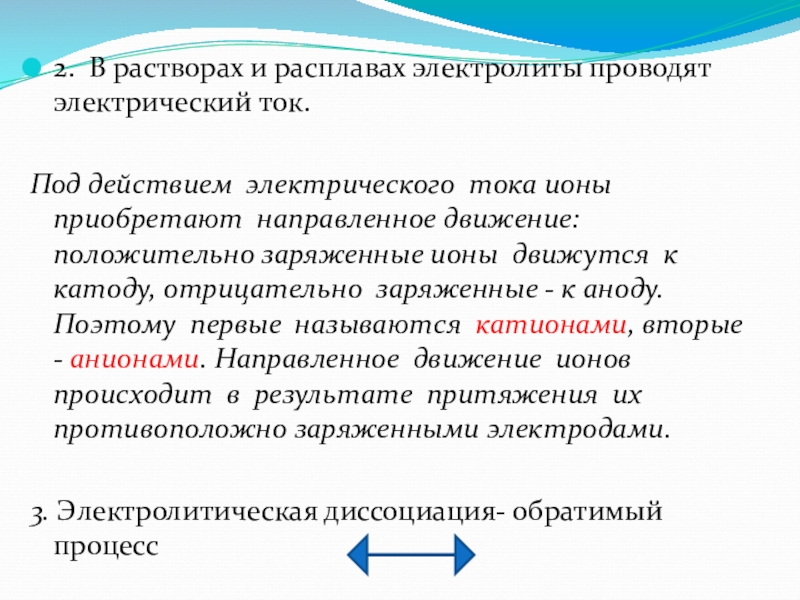 1. Электролиты при растворении в воде или расплавлении распадаются (диссоциируют) на ионы –катионы и анионы