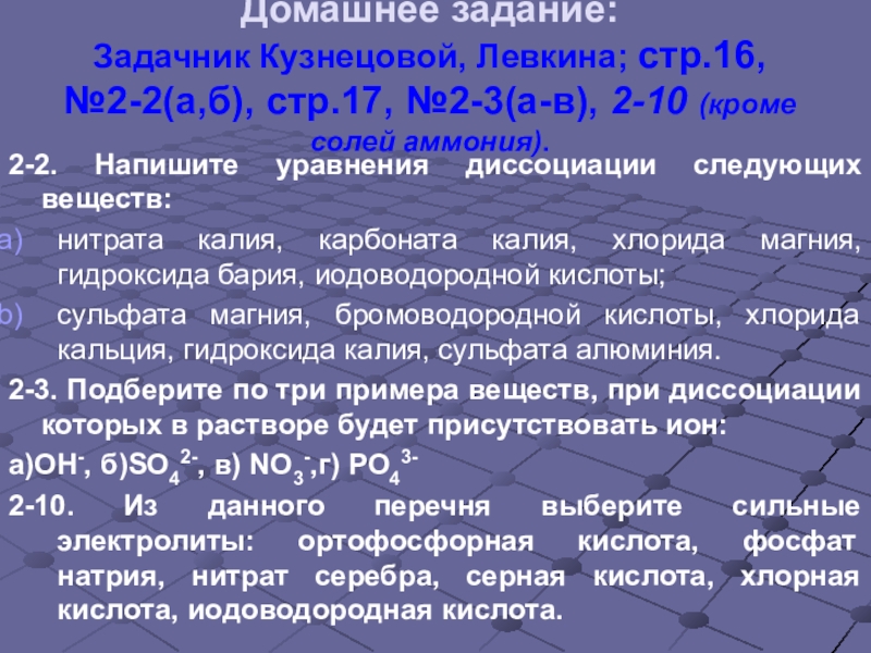 2-3. Подберите по три примера веществ, при диссоциации которых в растворе будет присутствовать ион: