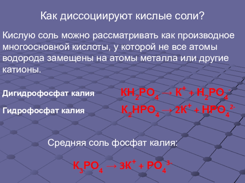 Кислую соль можно рассматривать как производное многоосновной кислоты, у которой не все атомы водорода замещены на атомы металла или другие катионы.