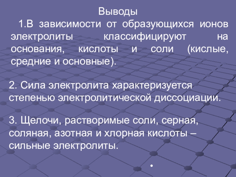 3. Щелочи, растворимые соли, серная, соляная, азотная и хлорная кислоты – сильные электролиты.