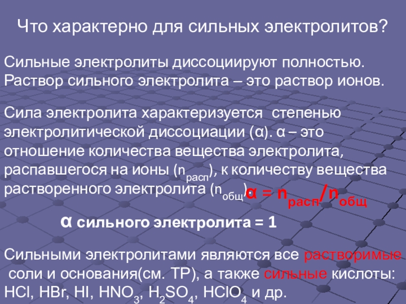 Сила электролита характеризуется степенью электролитической диссоциации (α). α – это отношение количества вещества электролита, распавшегося на ионы (nрасп), к количеству вещества растворенного электролита (nобщ).