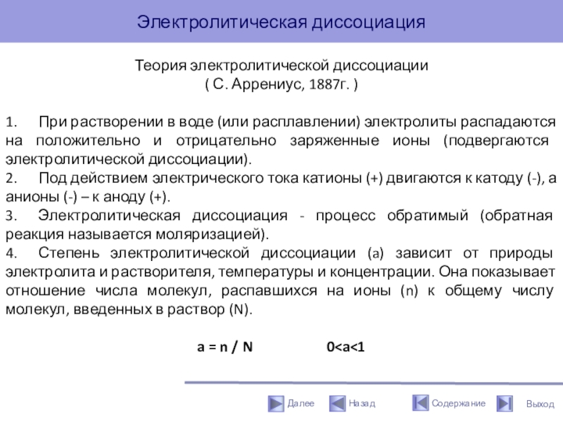 3. Электролитическая диссоциация - процесс обратимый (обратная реакция называется моляризацией).