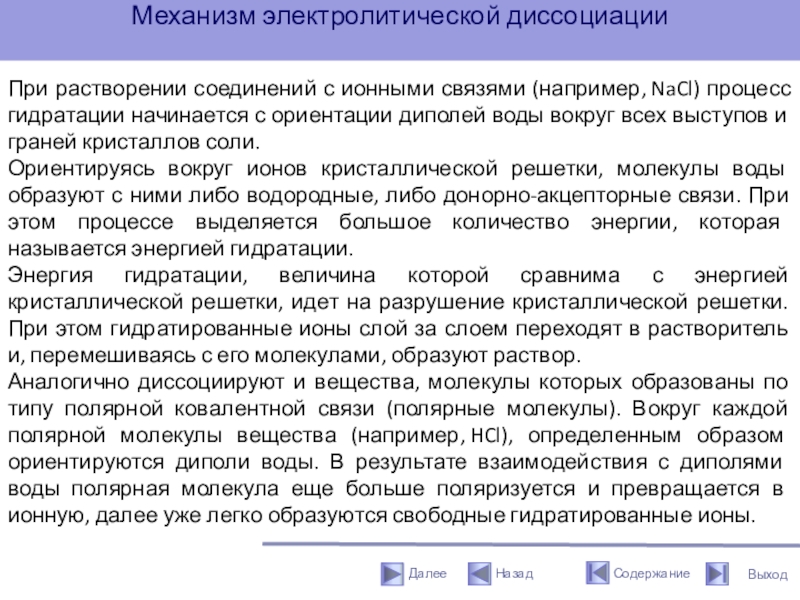 Аналогично диссоциируют и вещества, молекулы которых образованы по типу полярной ковалентной связи (полярные молекулы). Вокруг каждой полярной молекулы вещества (например, HCl), определенным образом ориентируются диполи воды. В результате взаимодействия с диполями воды полярная молекула еще больше поляризуется и превращается в ионную, далее уже легко образуются свободные гидратированные ионы.
