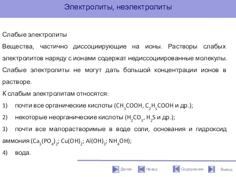 с ионами содержат недиссоциированные молекулы. Слабые электролиты не могут дать большой концентрации ионов в растворе.