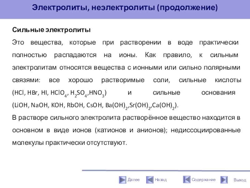 полностью распадаются на ионы. Как правило, к сильным электролитам относятся вещества с ионными или сильно полярными связями: все хорошо растворимые соли, сильные кислоты (HCl, HBr, HI, HClO4, H2SO4,HNO3) и сильные основания (LiOH, NaOH, KOH, RbOH, CsOH, Ba(OH)2,Sr(OH)2,Ca(OH)2).