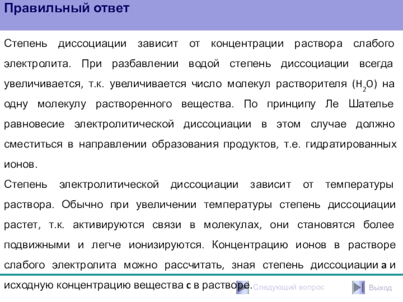 Слайд 16Степень диссоциации зависит от концентрации раствора слабого электролита. При разбавлении водой