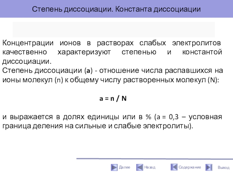 Степень диссоциации. Константа диссоциации Степень диссоциации. Константа диссоциации