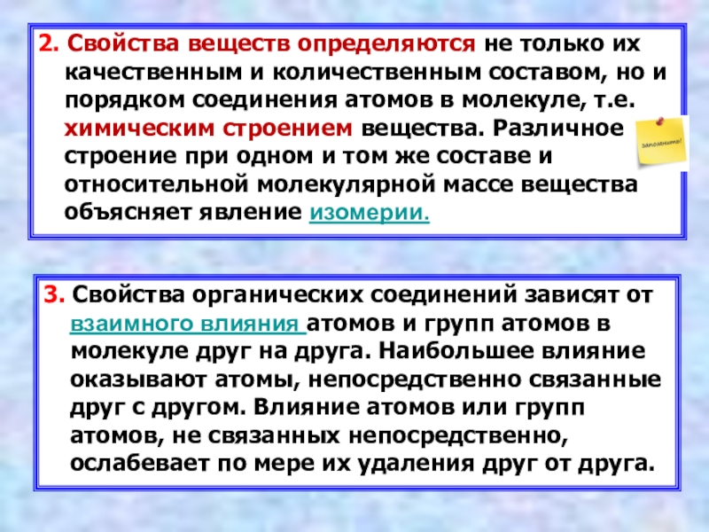 3. Свойства органических соединений зависят от взаимного влияния атомов и групп атомов в молекуле друг на друга. Наибольшее влияние оказывают атомы, непосредственно связанные друг с другом. Влияние атомов или групп атомов, не связанных непосредственно, ослабевает по мере их удаления друг от друга.