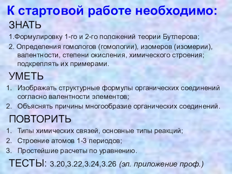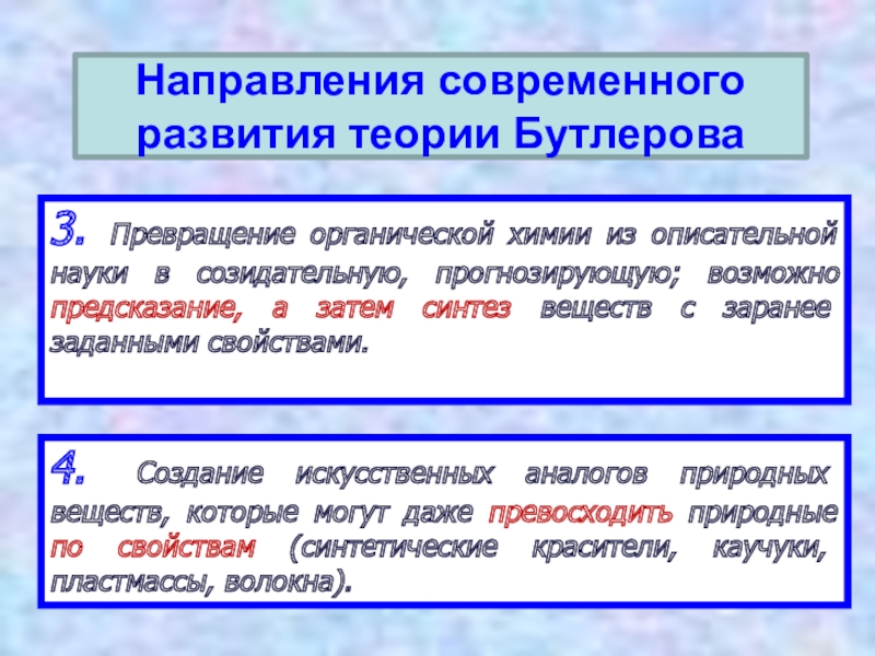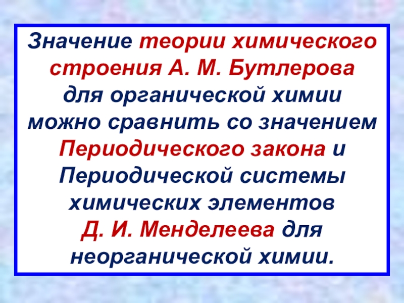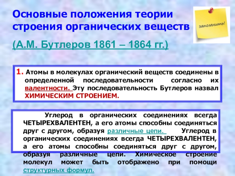 1. Атомы в молекулах органический веществ соединены в определенной последовательности согласно их валентности. Эту последовательность Бутлеров назвал ХИМИЧЕСКИМ СТРОЕНИЕМ.