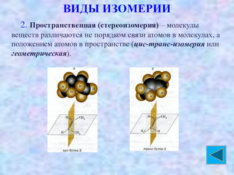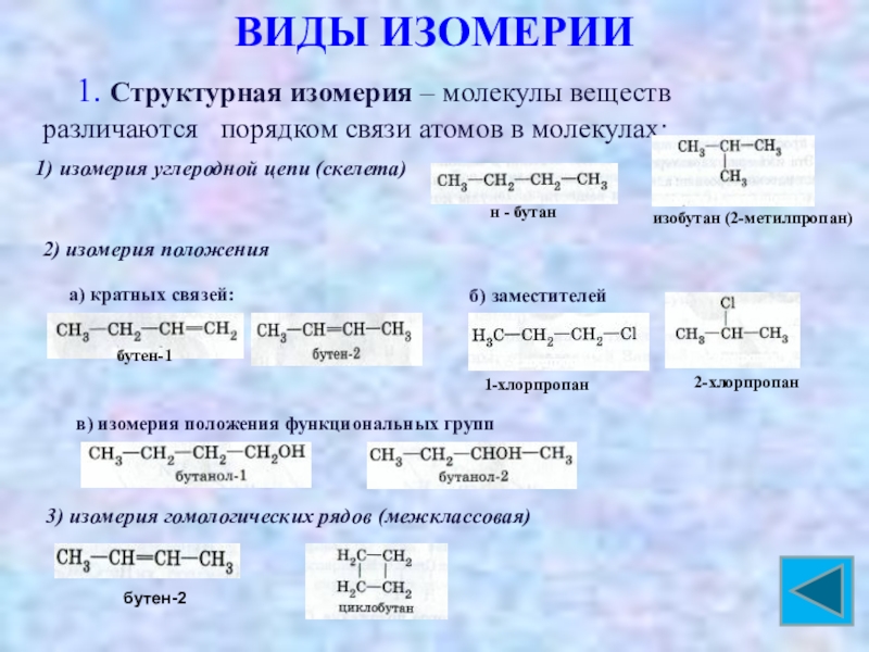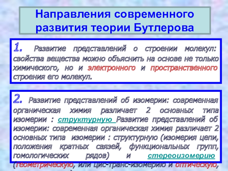 2. Развитие представлений об изомерии: современная органическая химия различает 2 основных типа изомерии : структурную Развитие представлений об изомерии: современная органическая химия различает 2 основных типа изомерии : структурную (изомерия цепи, положения кратных связей, функциональных групп, гомологических рядов) и стереоизомерию (геометрическую, или цис-транс-изомерию и оптическую, или зеркальную).
