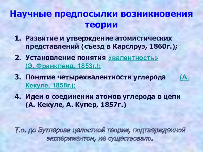Т.о. до Бутлерова целостной теории, подтвержденной экспериментом, не существовало.