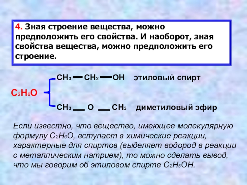 Если известно, что вещество, имеющее молекулярную формулу С2Н6О, вступает в химические реакции, характерные для спиртов (выделяет водород в реакции с металлическим натрием), то можно сделать вывод, что мы говорим об этиловом спирте С2Н5ОН.