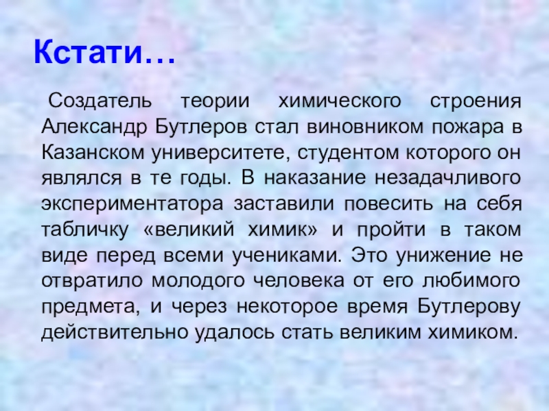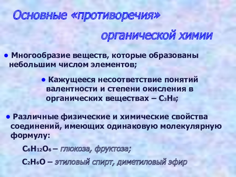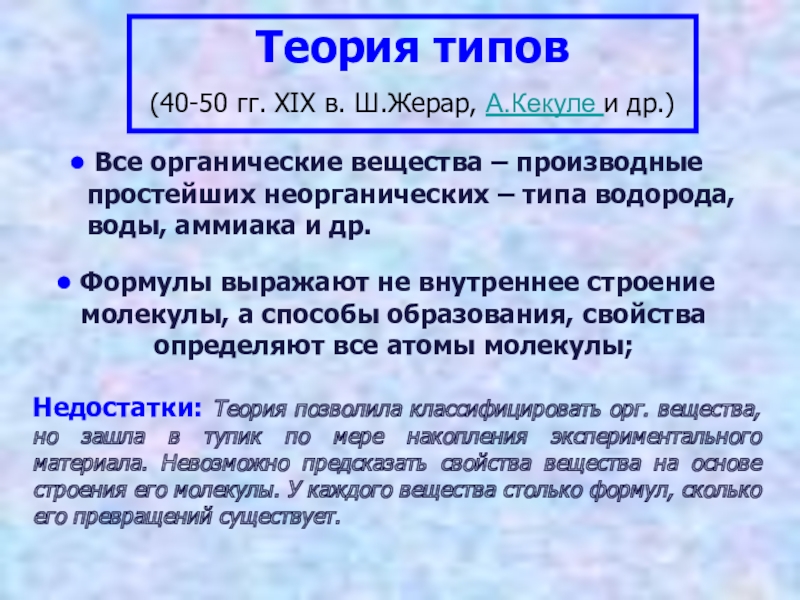 Недостатки: Теория позволила классифицировать орг. вещества, но зашла в тупик по мере накопления экспериментального материала. Невозможно предсказать свойства вещества на основе строения его молекулы. У каждого вещества столько формул, сколько его превращений существует.