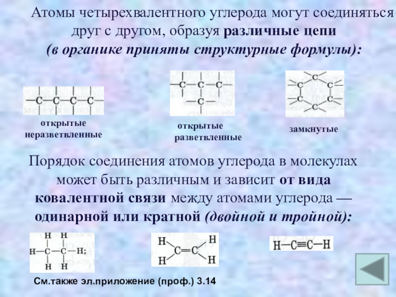 Порядок соединения атомов углерода в молекулах может быть различным и зависит от вида ковалентной связи между атомами углерода — одинарной или кратной (двойной и тройной):