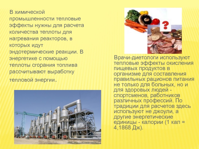 Врачи-диетологи используют тепловые эффекты окисления пищевых продуктов в организме для составления правильных рационов питания не только для больных, но и для здоровых людей - спортсменов, работников различных профессий. По традиции для расчетов здесь используют не джоули, а другие энергетические единицы - калории (1 кал = 4,1868 Дж).