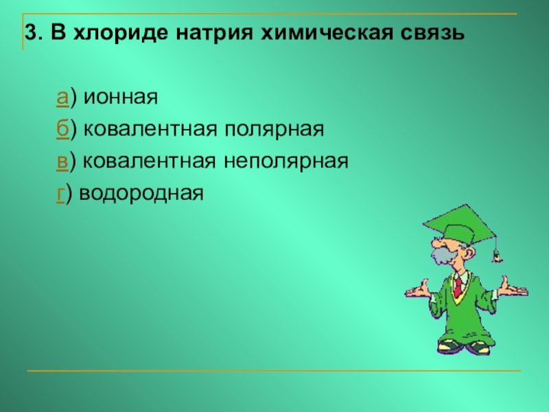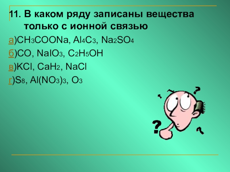 Слайд 1311. В каком ряду записаны вещества только с ионной связью